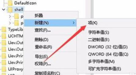 接着右键点击Shell注册表项,然后在弹出菜单中依次点击“新建/项”菜单项
