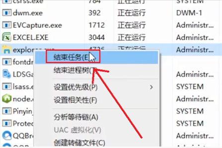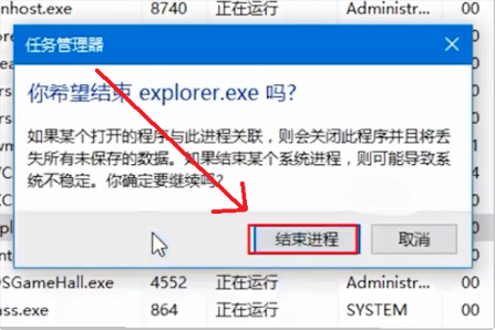 4、点击后,出现菜单栏,找到“结束任务(E)”,点击结束任务。点击后出现结束进程提示框,点击“结束进程”即可。