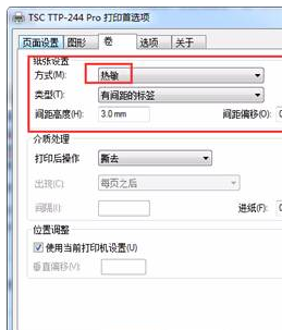 2、在打印机首选项窗口下,选择第三个“卷”选项卡,注意该窗口下纸张设置栏中的“方式”及“类型”。方式可以选择是热敏打印还是热转印。