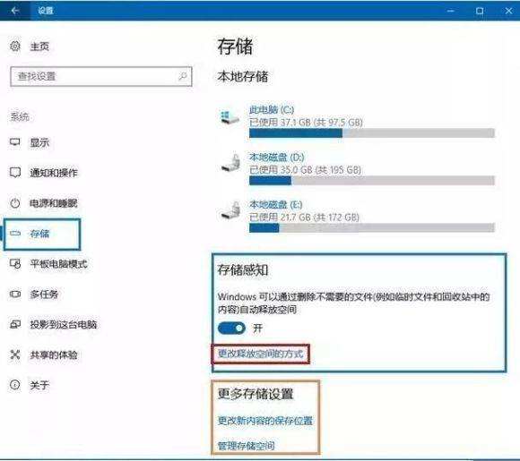 Win10 1703以上版本支持的存储感知功能,能让系统通过删除不需要的文件(如临时或回收站内的文件等)来自动释放空间。