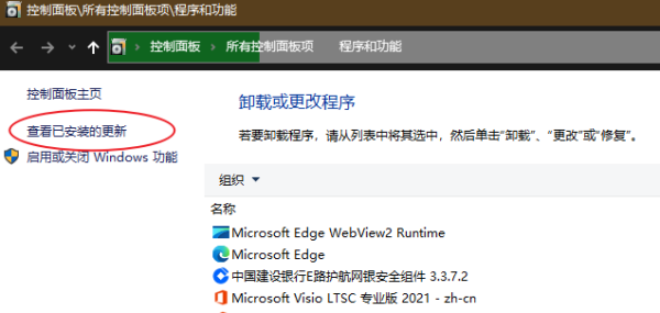 3.卸载程序页面左上角“查看已安装的更新”。把近两个周内安装的更新全部删除。