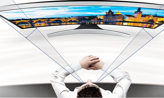 相对来说,同样尺寸的显示器屏幕,曲面屏幕给人的感觉要更大,视野更广,因为微微向用户弯曲的边缘能够更贴近用户,与屏幕中央位置实现基本相同的观赏角度。