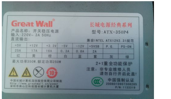 1、台式机的电源一般在铭牌上都有标额定多少W的,比如下面这个电源,就是额定250W的,但输出最大能达到350W。如图: