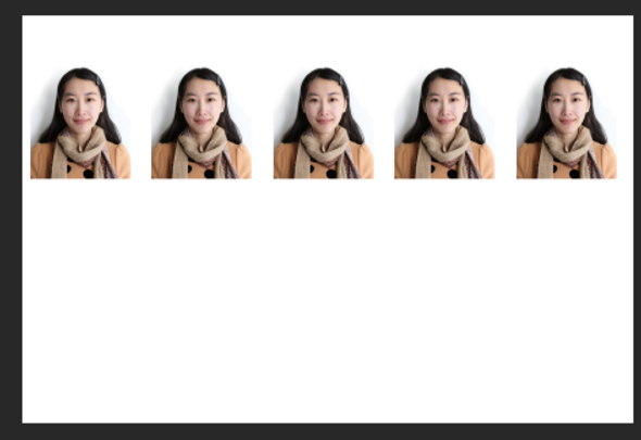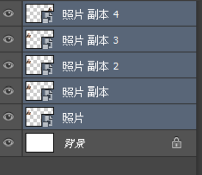 三、 处理完照片以后保存为jpg格式。 将刚才保存的照片拖入之前第一个建的画布中,放到最左边,按Ctrl+J,复制照片,复制5张,选中最后一张“照片 副本4”,放到最右边。