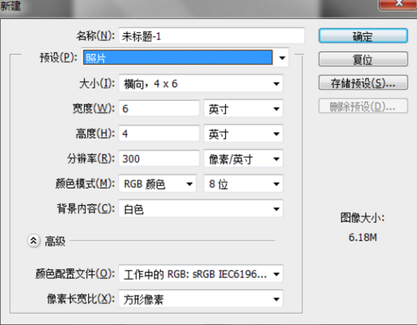 步骤:一、 打开ps,新建文件,预设:照片;大小:横向4x6;点击确定。这是要打印的画布。