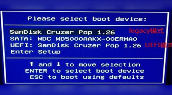 2、获取到电脑机型的U盘启动快捷键后,重启/开启电脑出现开机画面后按下快捷键,进入优先启动项设置界面(不同机型界面风格不一,但选项一般会相似),通过“↑↓”键选择U盘选项后回车进入大白菜winpe界面(该选项的目的是将U盘作为电脑启动项,从而使用U盘里的PE系统启动电脑),如下图所示,选择带有USB字样的或者选择自己的U盘名称标识(这里我u盘名称就是Sandisk Cruzer pcp1.26)