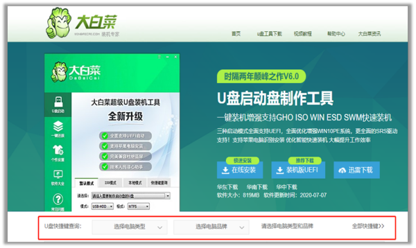 为什么要重装系统?操作系统变得缓慢不堪了?出现各种莫名其妙的故障了?中毒了?为了解决这些故障,许多人都会祭起重装系统大法来重新安装一个全新的系统,对付系统软件故障,这种作法通常都很有效。 使用U启盘重装系统最好要选择比较知名的装机软件,这样最岂码可以保证软件的稳定性。目前市面上、各类网站上有非常多的重装系统软件,那到底哪一款才是最为纯净安全的呢?我最常用的是“大白菜装机工具”,我觉得大白菜即安全又稳定,那么接下来就详细讲一下,大白菜装机工具的来源、制作方法,以及一些注意事项。