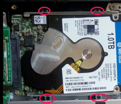 3. 用小十字起子,把机械硬盘周围的螺丝起出来,一般有四个螺丝。