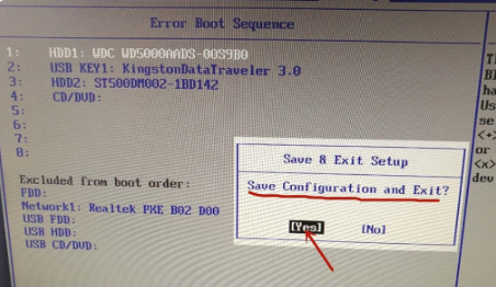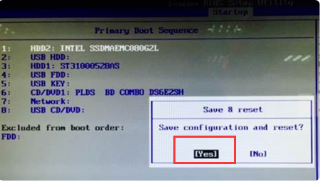 7、调整到第一位置后,按F10键保存设置后退出,此时会弹出一个窗口,选择YES。