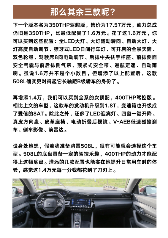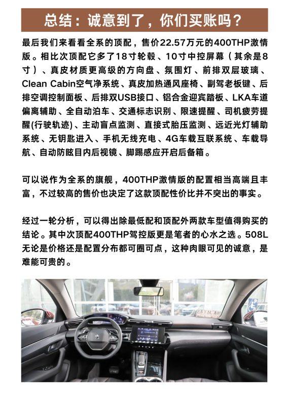 经过一轮分析,可以得出除最低配和顶配外两款车型值得购买的结论。其中次顶配400THP驾控版更是笔者的心水之选。508L无论是价格还是配置分布都可圈可点,这种肉眼可见的诚意,是难能可贵的。