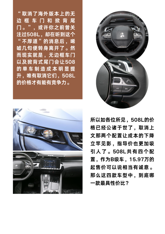 “取消了海外版本上的无边框车门和掀背尾门。”,或许你之前曾关注过508L,却在听到这个“不厚道”的消息后,唏嘘几句便转身离开了。然而现实就是,无边框车门以及掀背式尾门会让508的单车制造成本明显提升,唯有取消它们,508L的价格才有能有竞争力。