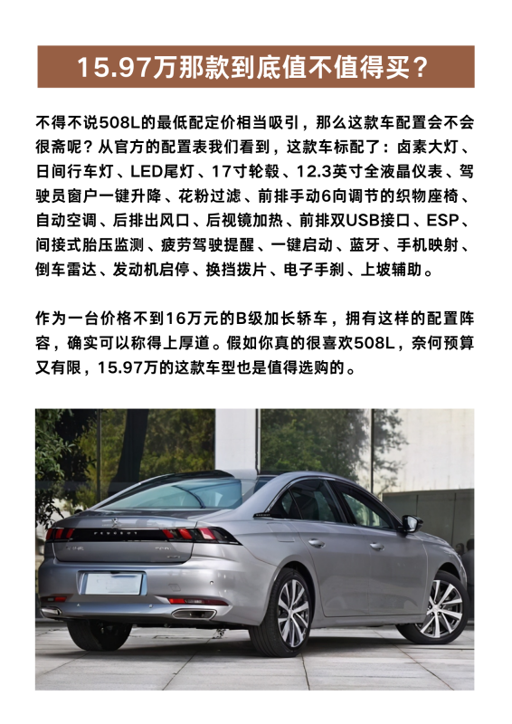 作为一台价格不到16万元的B级加长轿车,拥有这样的配置阵容,确实可以称得上厚道。假如你真的很喜欢508L,奈何预算又有限,15.97万的这款车型也是值得选购的