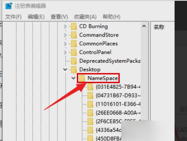 3、然后依次展开注册表编辑器中的选项“hekey_local_machime/software/Microsoft/windows/currentversion/explorer/desktop/namespace”。