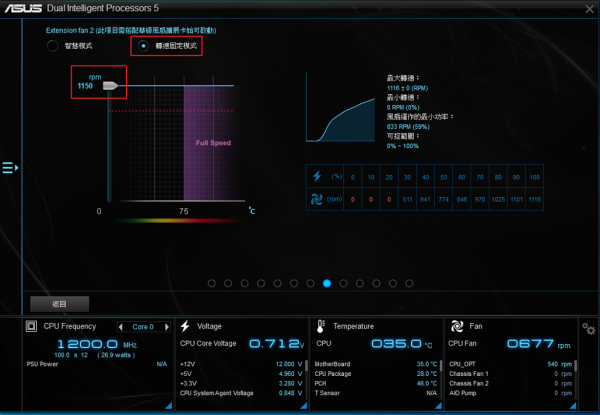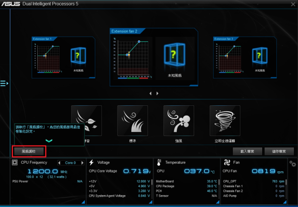 6. 调校完成后,若要更改风扇转速设定,可从下方选单中,选择一个默认模式。选择的模式将套用到所有风扇上。