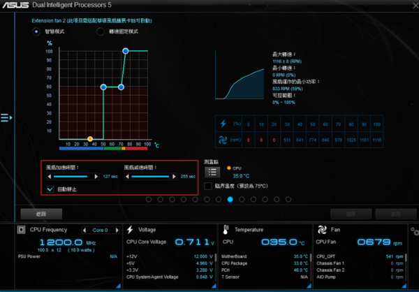 10. 在智能模式下,另可调整风扇加速时间与风扇减速时间,避免风扇转速于短时间内剧烈变化。勾选自动静止,当风扇转速过低时,风扇会自动静止。