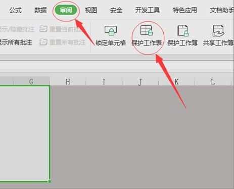 5、第五步,执行完上面的操作之后,还是选择白色框,在表格上方的工具栏中找到“审阅”选项,然后在此选项中单击“保护工作表”选项,见下图,转到下面的步骤。