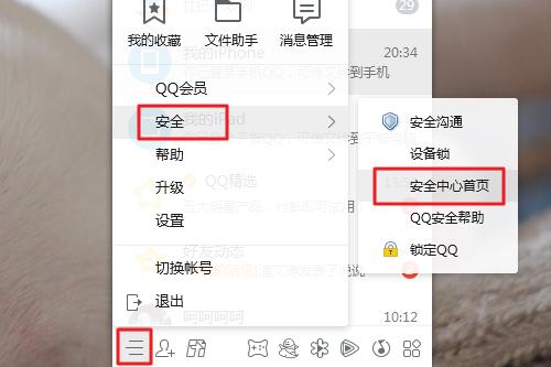1、在自己的qq主页面,点击主界面左下角的主菜单,选择安全-安全中心首页。