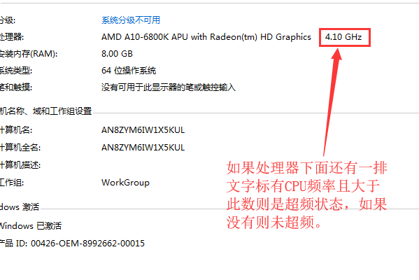 五、这时就能够看到CPU的型号和频率道,如果处理器下还有一排文字标有CPU频率且大于处理器频率,则是超频状态,如果没有则是未超频。