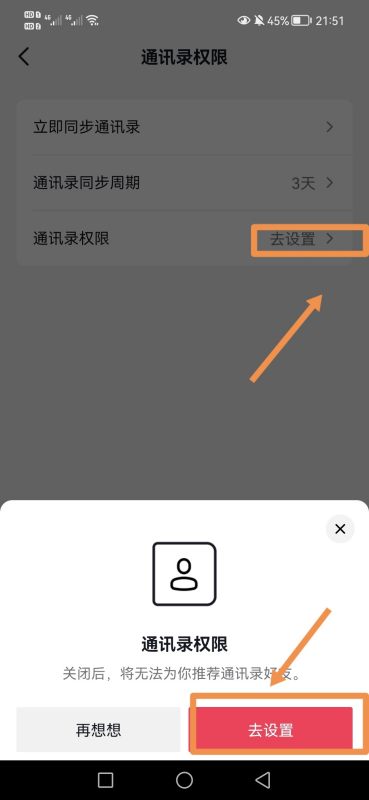 6.在这里选择【去设置】通讯录权限,如图所示: