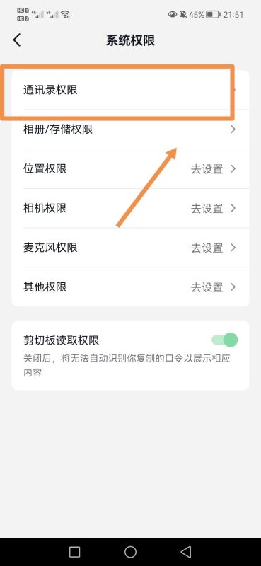 6.先点击【通讯录权限】,再选择【去设置】: