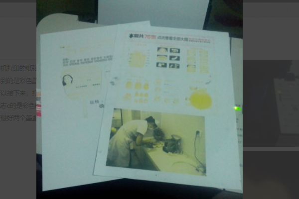 看是几色的打印机,如果是4色的,打印的图像偏蓝,还有黄色和绿色的时候,就是红色没墨或没粉了,或者是红色的墨盒喷口堵了,如果是喷墨打印机,可以用棉签或棉花蘸酒精,擦拭一下试试,一般修复率为30%,如果还不行就送到修理打印机的地方,用超声波清洗器洗一下墨头试试,打印机颜色 一般都是三原色调对的,很好理解。