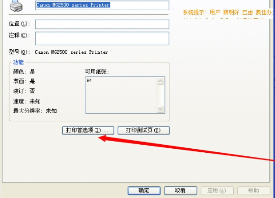 4、,出现打印机对话框后,单击打印机目录下的打印首选项,打开另一个对话框。