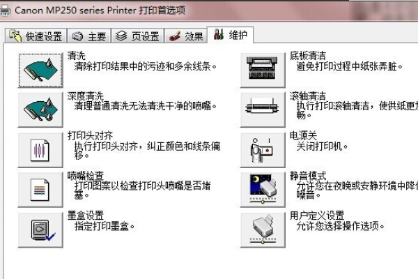 6、单击此对话框的“维护”一项,执行“清洗”操作。打印测试页,看看效果。再执行“喷嘴检查”操作,一般执行这两项后就能解决问题了。