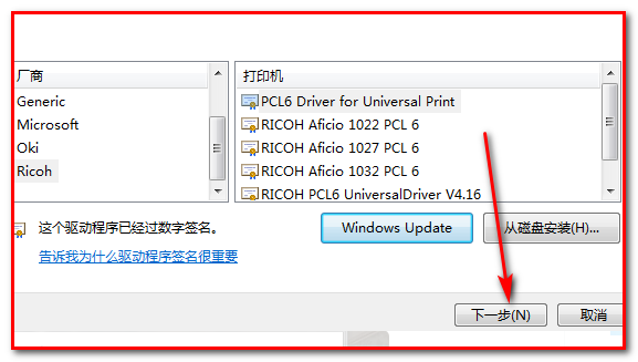 5、选择需要安装的打印机型号,然后点击下一步。