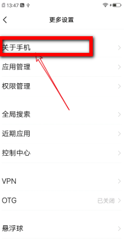 2、进入更多设置界面之后,选择点击”关于手机“选项,如下图所示。