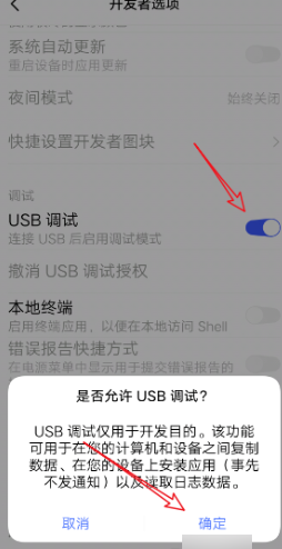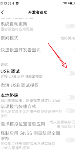 5、在开发者选项页面中,打开”USB调试“后面的开关按钮,如下图所示。