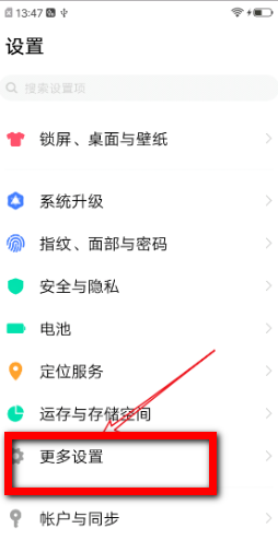 1、首先打开手机设置功能,然后选择点击”更多设置“选项,如下图所示。
