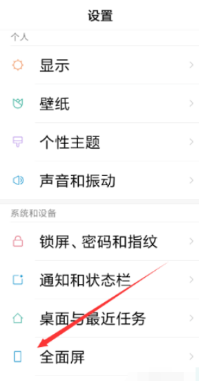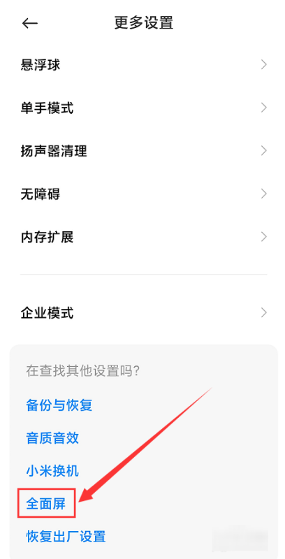 2、切换到更多设置界面之后,找到页面下方的全面屏并点击。