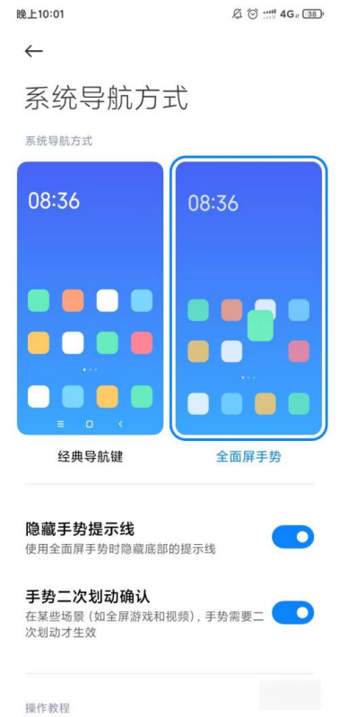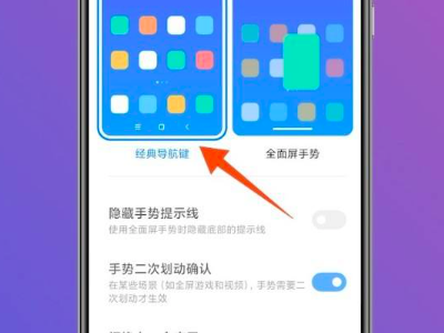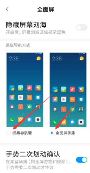 4、在打开的界面中显示“经典导航键,全面屏手势”的切换按钮。