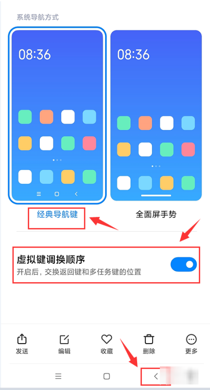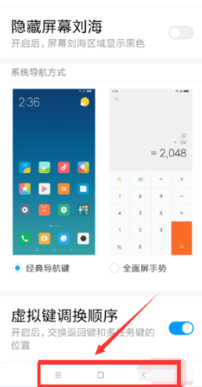 进入全面屏界面,选择经典导航键,打开虚拟键调换顺序,点击返回键。