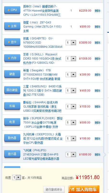CPU和主板上花钱太多,丽台K2000是专业制图卡,打游戏性能渣的一比,机箱买太贵了,150撒哈拉G6足够了,航嘉电源就是渣,换海韵,安钛克,海盗船,振华的吧,散热器也上的不对,AOC显示器国内卖的太渣了,换飞利浦,三星,戴尔,索尼这些一线牌子吧