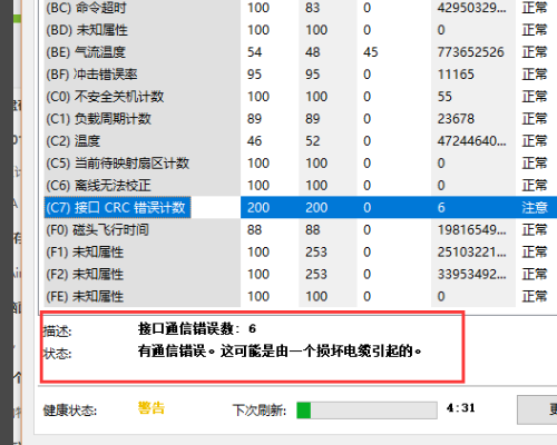 当错误数据达到一个阈值时就会发出警告。这个问题一般是SATA口或者数据线接触不良,数据线质量较差或者机箱内电磁干扰严重导致的。