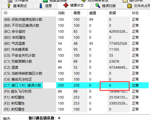 4、观察(c7)Ultra DMA CRC 错误计数数值有没有继续上升,数值如果上升,可以换一条数据线试试。