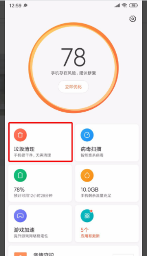 2、进入安全中心后,可以看到项目中第一个是【垃圾清理】,点击进入。