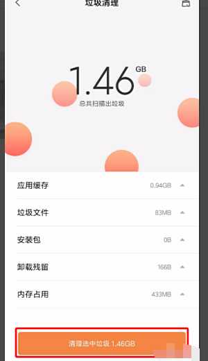 3、进入会系统会自动扫描垃圾,等扫描完成后可以看到我的手机有1.46G的垃圾,点击【清理选中的垃圾】,就可以把这些清理干净。