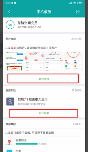 5、点击进去后可以到【手机瘦身】页面中,可以先去清理掉一些不要的【照片】以及一只不使用的【手机软件】,特别是手机软件会占用很大的空间的哦。删除掉这样也会省下很多空间。
