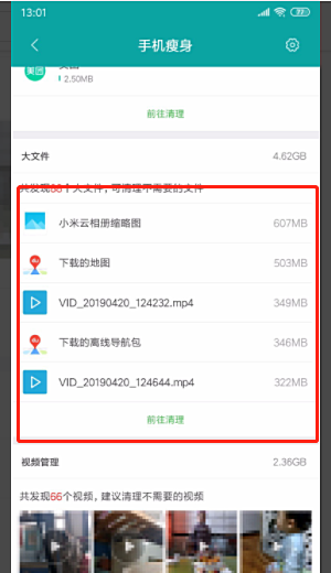 6、接着向上滑屏还可以找到【大文件清理】,进去把一些不用的大文件也都删掉。