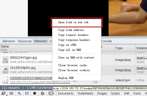 4、这时候就可以看见要找到的视频文件出来了,就是这个最大的文件。右键点击,然后选择“Open link in new tab”。