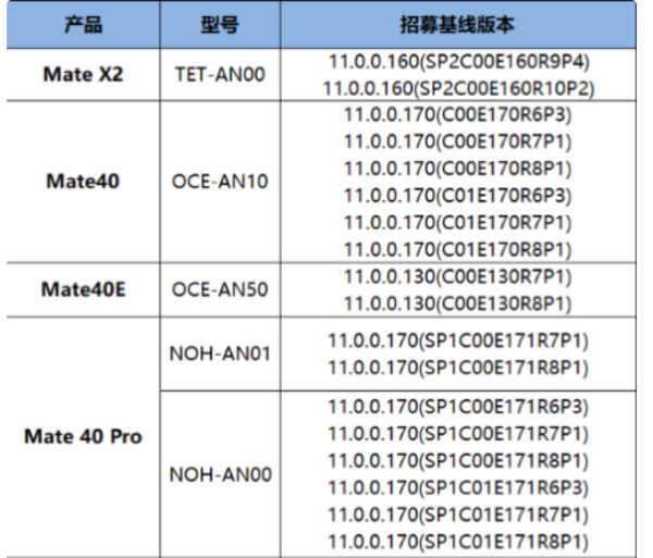 Mate X2、Mate40、Mate40E、Mate 40 Pro、Mate 40 Pro+、Mate 40 RS 保时捷设计、P40、P40 Pro、P40 Pro+、Mate 30 4G、Mate 30 Pro 4G。