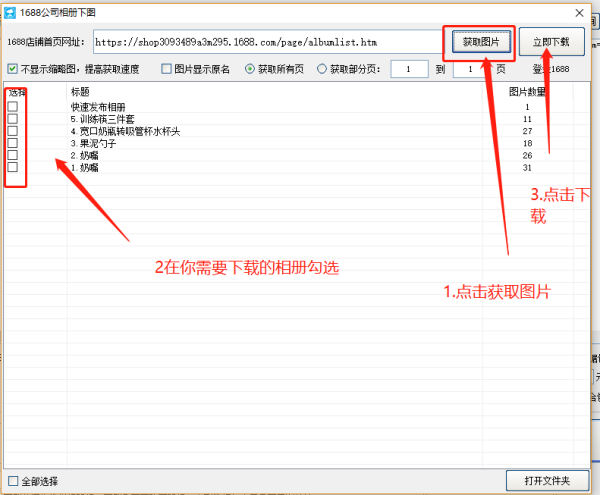 3. 把网址复制到软件地址栏,之后我们点击获取图片 勾选你需要的相册 点击下载