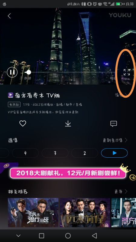 可点击正在播放的视频,一般在视频右下角会显示有切换全屏播放的功能键。