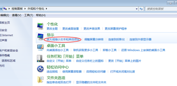 3、在【外观和个性化】界面的【显示】模块下面,有一个选项【放大或缩小文本和其他项目】,点击它。