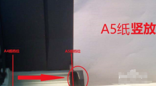 7、页面设置完毕后,接下来同上个方法一样,需要调整打印机进纸口大小。将拨板如图调整,以适应A5尺寸纸张。特别要注意的是—A5纸需要竖放。