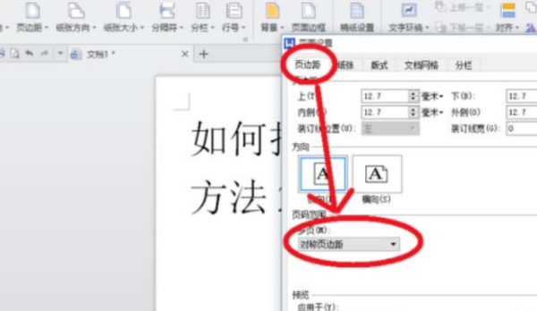 6、在打开的窗口点击【页边距】,接着在页码范围一栏选择【对称页边距】,实际效果就是一张A4纸被分割成了两张A5纸。