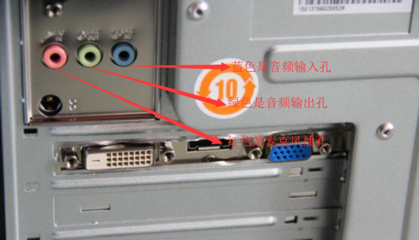 音响插口可以根据插口对应的标识图案和颜色来辨认,图标是音箱一个喇叭状的图标、耳机是一个耳机的图标,麦克上面标麦克的标志或者通过颜色也可以辨识,绿色是耳机或者音箱,红色是话筒 蓝色是音频输入。