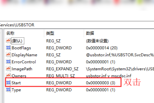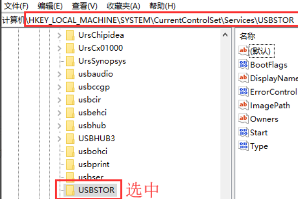 2、展开HKEY_LOCAL_MACHINE \ SYSTEM \ CurrentControlSet \ Services,找到USBSTOR,然后选择它。